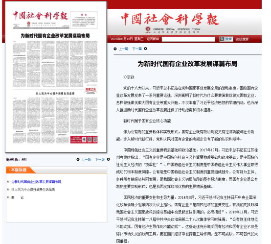 经济学院李政教授在2023年614中国社会科学报头版发表题为《为新时代国有企业改革发展谋篇布局》的署名文章,全文如下: